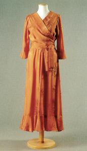 Abito lungo intero tagliato in vita. Il corpetto incrociato forma una scollatura a punta e due lunghe cocche che si annodano sul dorso. La schiena è arricciata nel giro vita. Le maniche a tre quarti sono rifinite all'orlo con una balza in sbieco. La gonna, leggermente arricciata, presenta una balza in sbieco all'orlo.