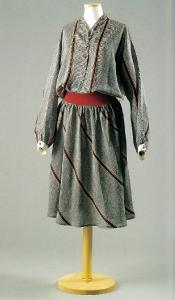 Abito intero tagliato in vita. Il corpetto, a camicia maschile tagliata a T, ha una parziale abbottonatura sottolineata da un cannoncino riportato, foderato di bianco, che prosegue sulla nuca a formare un colletto a listino. L'ampiezza del dorso è data da un cannone centrale e da un'arricciatura al collo. Le maniche sono lunghe e terminano con un polsino bianco abbottonato. Un ampio tassello quadrangolare di tessuto bianco è inserito sotto l'ascella. La gonna arricciata è formata da due teli tagliati in sbieco con tasche inserite nelle cuciture. Il punto vita è segnato da un'altra cucitura di elastico rosso.