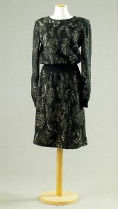L'abito, tagliato in vita, non presenta allacciature. Il corpetto, diritto, ha il collo a giro profilato, spalle imbottite con spalline, maniche lunghe con polsini di maglia a coste. In vita, cintura inserita di maglia a coste. Gonna diritta a due teli leggermente arricciata in vita.
