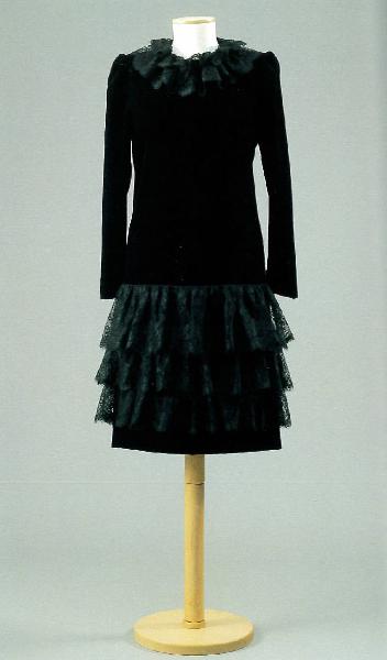 Abito da sera corto intero a tubino con spalle diritte sostenute da spalline imbottite, maniche lunghe montate arricciate e collo a giro bordato da due volant di pizzo. Sulla gonna, con un effetto di vita bassa, sono applicate tre balze parallele di pizzo arricciato.