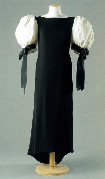 Abito da sera di alta moda nero lungo a tubino con scollatura a barchetta e breve strascico a godet. Le voluminose mezze maniche a palloncino, montate arricciate e sostenute da imbottitura e alette di crine, sono riprese al gomito da una fascia di raso foderata di taffetas annodata in un fiocco con lunghe cocche ricadenti.