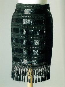 Gonna corta da sera, aderente, a teli, bordata all'orlo con frangia a festoni di cordoncino e nappine pendenti.