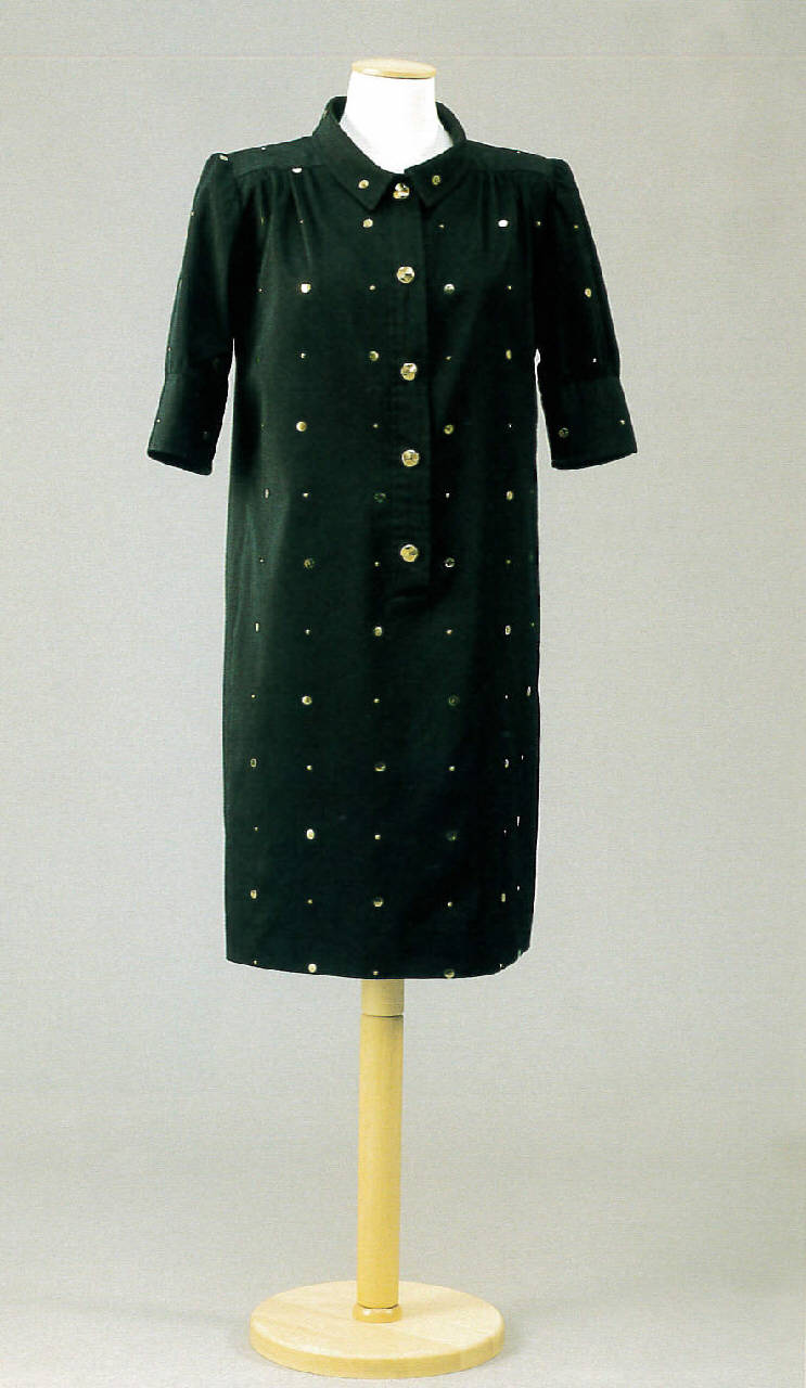 Abito di alta moda intero diritto a chemisier con spalle imbottite e carré arricciato. Il colletto è rotondo con punte, l'apertura abbottonata giunge fino all'inguine. Le maniche al gomito sono montate leggermente arricciate e terminano con un alto polsino.
