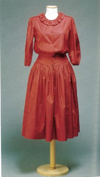 Camicetta diritta abbottonata davanti, con scollo rotondo bordato da una ruche e spalle diritte imbottite. Maniche a tre quarti montate arricciate e riprese al polso con elastico a coulisse. Gonna ampia a cannoni sciolti, con baschina, sagomata e intelata, abbottonata al centro davanti.
