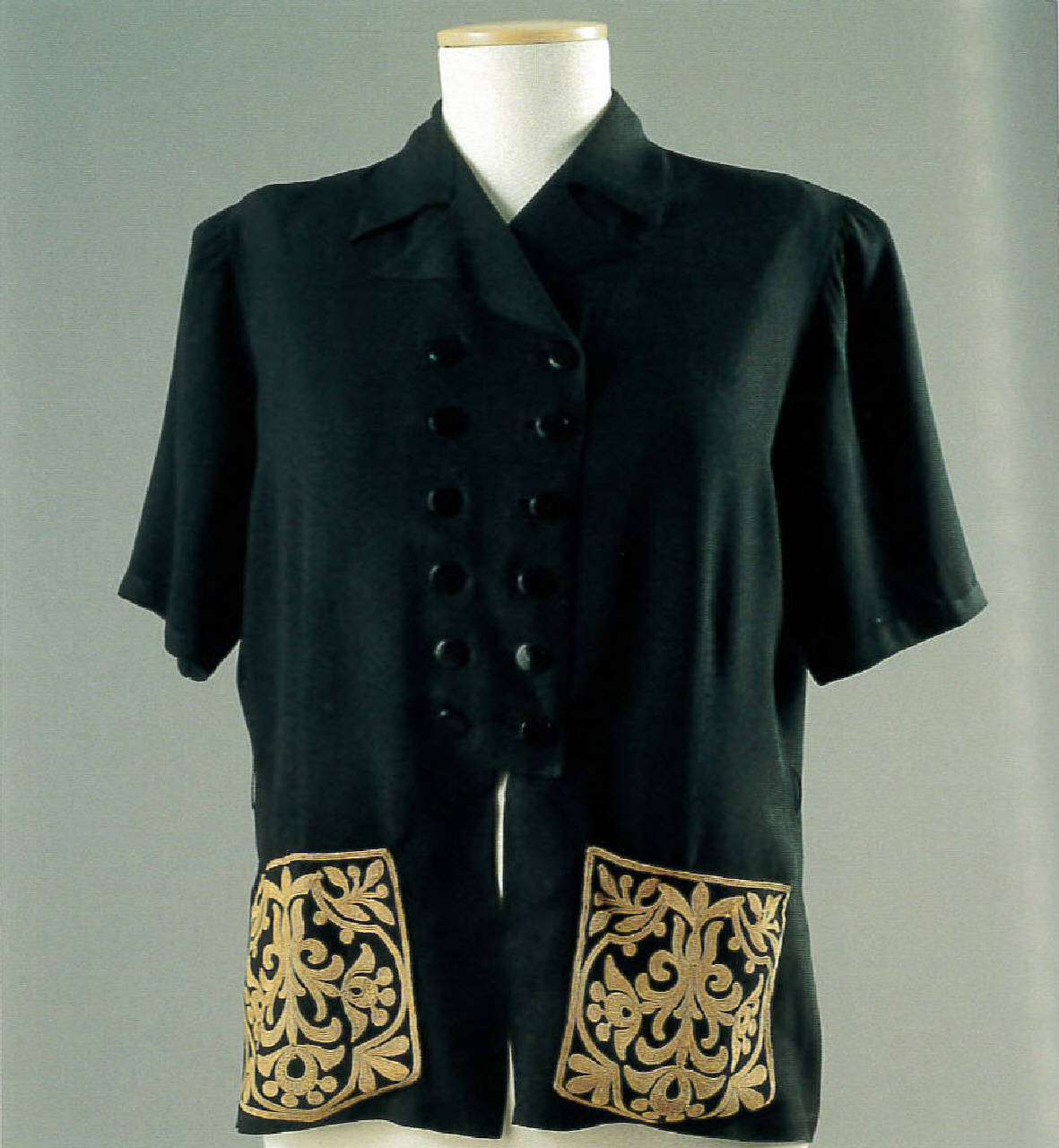 - NOTIZIE STORICO CRITICHE La giacca, acquistata a Parigi negli anni Settanta, è ispirata a un modello di Schiapparelli (cfr. Blum 2004: "Giacca di crêpe di rayon nero, ornata di ricami oro con grandi tasche, della collezione primavera-estate 1940, indossata da Elsa Schiapparelli durante il suo viaggio negli Stati Uniti nel dicembre 1939, Philadelphia Museum of Art") e testimonia il rapporto di dipendenza della confezione dalle linee di tendenza dell'haute couture nei primi anni Quaranta. La taglia indicata nell'etichetta fa pensare a un prodotto francese.\nLa presenza di questo capo nel guardaroba di Silvana Bernasconi riguarda però un altro momento storico e la moda, diffusa negli anni Settanta, di acquistate abiti nei mercati delle pulci e nei negozi di seconda mano, dove era possibile reperire capi anche importanti dei periodi precedenti. La moda revival, che insisteva proprio sugli anni della guerra e immediatamente prebellici, favoriva gli accoppiamenti fra indumenti nuovi e vecchi.
