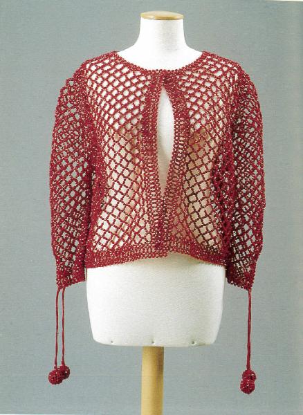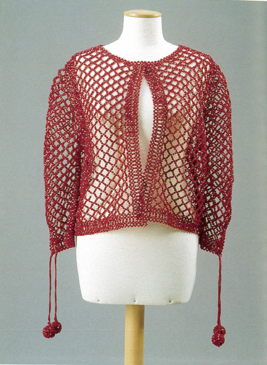 Giacchino diritto a giro collo allacciato con un gancio nascosto alla scollatura. Le maniche a tre quarti, montate a giro, terminano con polsini allacciati con nastri di velluto terminanti in una pallina rivestita di perle. Il capo è realizzato con una rete romboidale di cristalli rossi, che si infittisce e muta disegno sulle spalle, lungo i bordi della giacca e nei polsini.