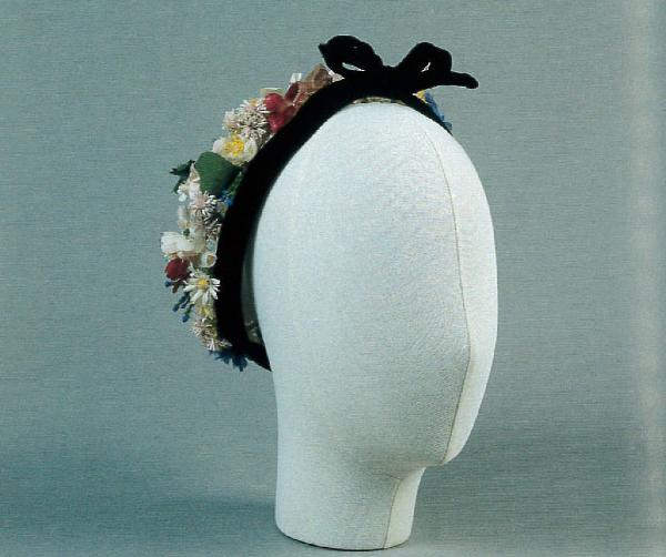 Calotta di rete, con un bordo di velluto sagomato che forma un fiocco rigido sul davanti, è completamente coperta da una fitta applicazione di piccoli fiori artificiali di tessuto.