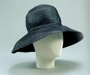 Cappello a tesa larga, sagomata in modo da essere più ampia sulla nuca che sulla fronte. Calotta arrotondata.