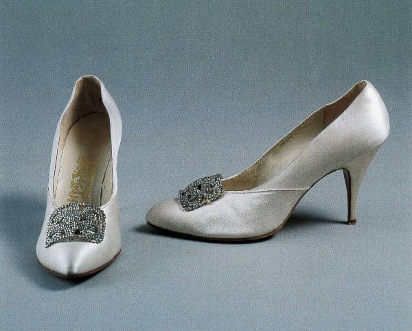 Décolleté di raso bianco divisa in due parti. Punta sfilata. Tacco alto ricoperto, sottopiede e fodera di pelle bianca. Fibbia metallica rettangolare a lavorazione globulare