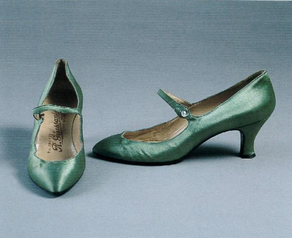 Scarpe con tomaia di raso verde menta che forma chiusura a cinturino con occhiello e bottone di strass. Scollatura larga. Punta sfilata. Tacco medio ricoperto. Sottopiede e fodera di pelle beige. Scuola di cuoio.