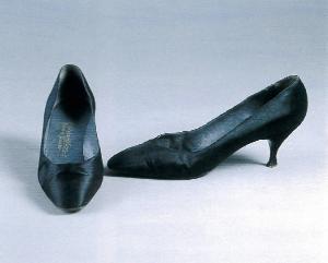 Décolleté con tomaia di raso nero. Punta arrotondata. Tacco medio ricoperto. Sottopiede e fodera di pelle grigia. Suola in cuoio.