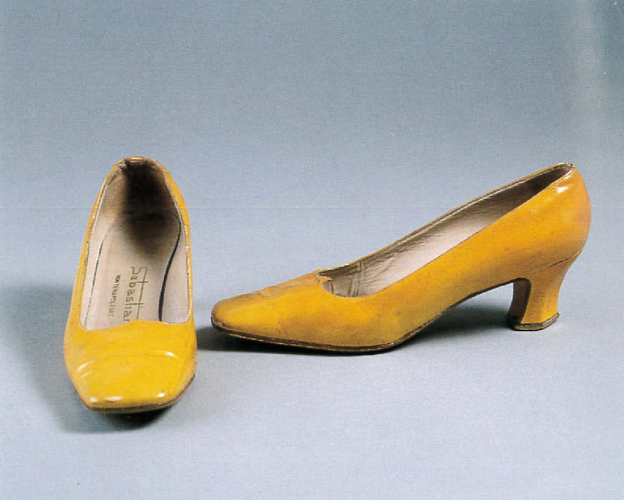 Décolleté con scollatura montante a punta. Tomaia di vernice gialla. Punta quadrata, tacco medio a sezione pentagonale ricoperto. Sottopiede e fodera di pelle beige. Suola di cuoio.