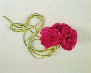 Le due rose con la corolla aperta sono unite all'altezza del calice. Il bouquet è completato da due lunghi steli pendenti, di nastro verde arrotolato attorno a un'anima di cordoncino di cotone bianco.