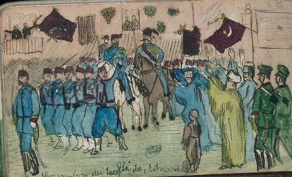 - NOTIZIE STORICO CRITICHE Serie di disegni conservati all'interno di un taccuino posseduto dall'artista Camillo Ghisi.\nScena raffigurante la parata in seguito allo sgombero dei turchi da Adrianopoli.
