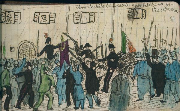 - NOTIZIE STORICO CRITICHE Serie di disegni conservati all'interno di un taccuino posseduto dall'artista Camillo Ghisi.\nScena raffigurante tafferugli in relazione all'"arresto" della bandiera repubblicana in Via Moscova.