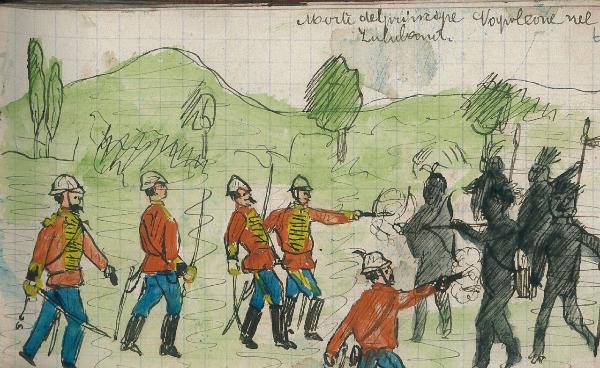 - NOTIZIE STORICO CRITICHE Serie di disegni conservati all'interno di un taccuino posseduto dall'artista Camillo Ghisi.\nScena raffigurante lo scontro tra l'esercito del principe Napoleone e gli zulu.