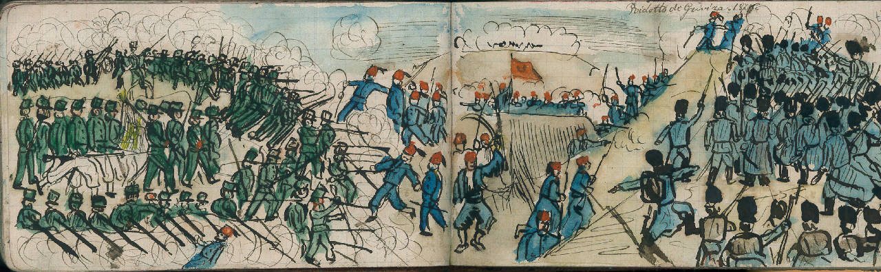 - NOTIZIE STORICO CRITICHE Serie di disegni conservati all'interno di un taccuino posseduto dall'artista Camillo Ghisi.\nScena raffigurante la battaglia di Griviza (Grivita) nel 1877.