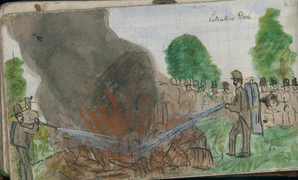 - NOTIZIE STORICO CRITICHE Serie di disegni conservati all'interno di un taccuino posseduto dall'artista Camillo Ghisi.\nScena raffigurante la simulazione dell'utilizzo di un estintore.
