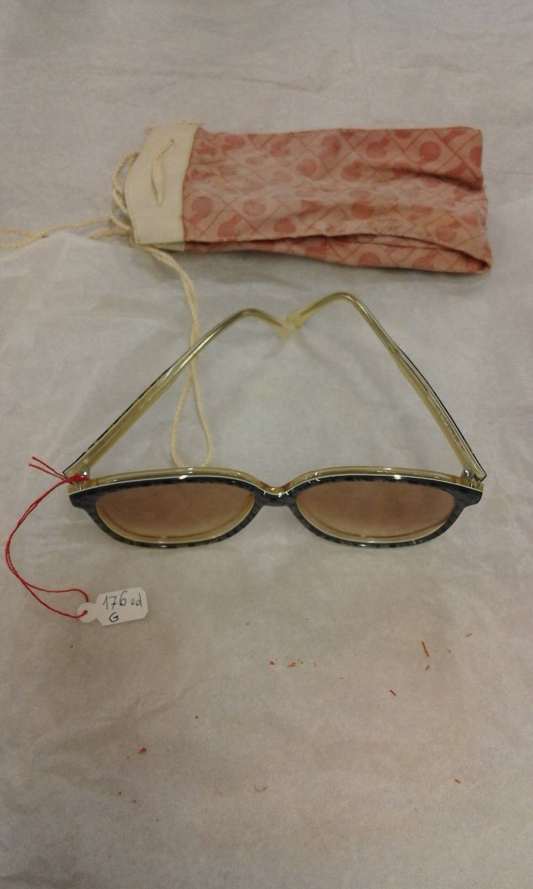 Occhiali da sole con montatura decorata con il marchio di fabbrica e lenti a goccia.\nCustodia in tessuto rosa e bianco con stemma ripetuto.