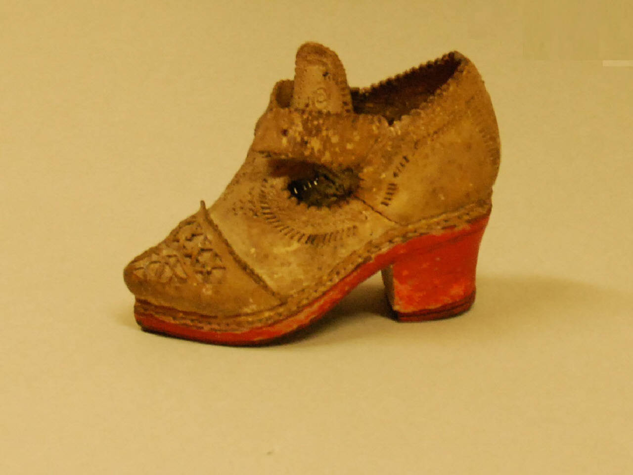 Scarpa da bambino con tomaia in pelle di capra sbiancata decorata con intagli a traforo. Chiusura a due cinturini con nastro di seta (non presente). Tacco di cartone dipinto in rosso.