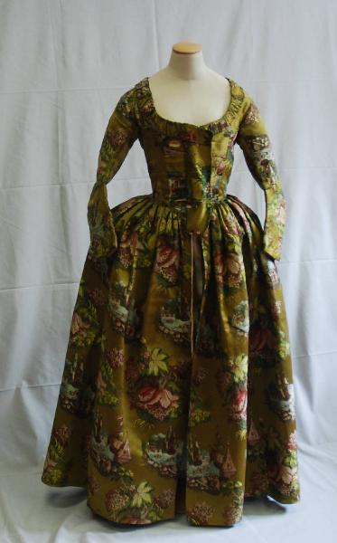 Robe à l'anglaise in raso verde broccato in seta policroma a "chinoiserie" composto da una veste aperta davanti e da maniche lunghe e strette. Il decoro in seta policroma broccata forma un disegno di paesaggi marini, architetture classicheggianti e alte torri alternati a grandi fiori "au naturel".