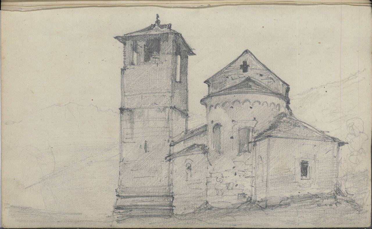 Schizzo realizzato a matita identificato come la Chiesa di San Vittore il Moro a Muralto. Nel disegno è ben visibile il campanile della collegiata e l'abside in pieno stile romanico.