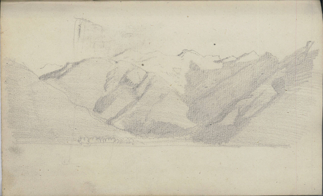 Paesaggio naturale a tratteggio con montagne realizzato a matina su cartoncino.