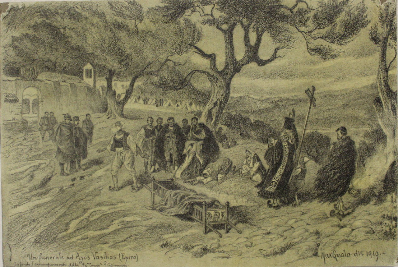 Un funerale ad Ayos Vasilios (Epiro). In fondo, l'accampamento della 70a Comp. Prigiornieri. prima guerra mondiale