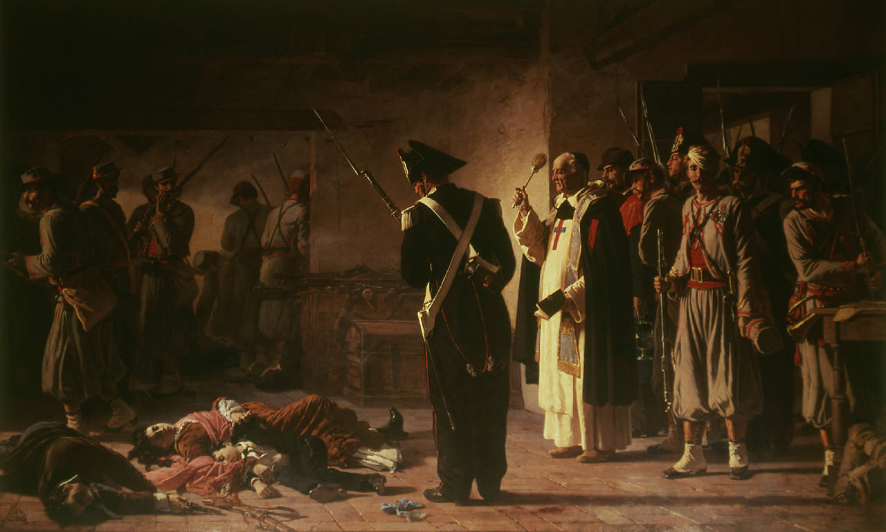 - NOTIZIE STORICO CRITICHE Figura in grande scala, ambientate in un interno (lanificio). Tragico episodio avvenuto a Trastevere durante la spedizione garibaldina di Mentana del 1867 per la liberazione di Roma. Un gruppo di patrioti fu sorpreso dai gendarmi mentre fabbricava cartucce all'interno del lanificio Ajani. Nello scontro furono trucidati dagli zuavi pontifici nove persone, tra cui Giuditta Tavani Arquati e i suoi tre figli.