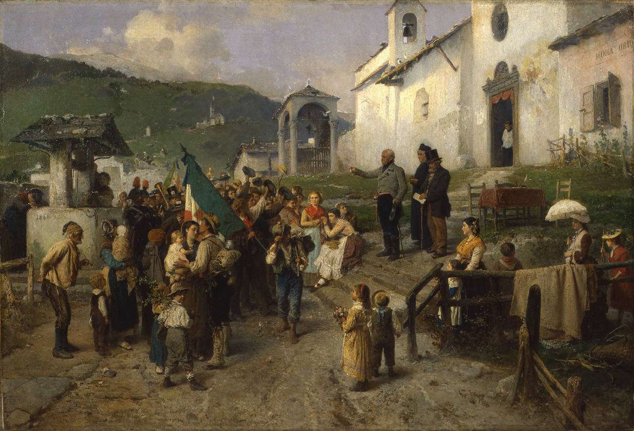 - NOTIZIE STORICO CRITICHE Grande dipinto con episodio storico-narrativo con figure in media scala, ambientate in un paesaggio naturale in prossimità della chiesa-scuola fulcro della comunità. Il quadro raffigura la partenza dei coscritti nella III° guerra d'indipendenza per la liberazione del Veneto, 1866. Il Regno d'Italia (17 marzo 1861) è qui evocato dal tricolore e dalle istituzioni presenti (sindaco, esercito, scuola comunale, arma dei carabinieri).\nDipinto commissionato da Vittorio Emanuele II