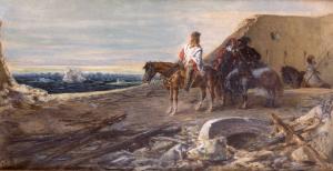 Dipinto su cartone con scena storico-narrativa in un paesaggio naturale