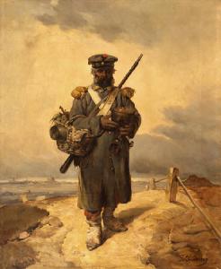 Dipinto su tela con figura umana intera su sfondo paesaggistico
