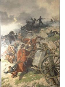 - NOTIZIE STORICO CRITICHE 24 giugno 1866: il dipinto raffigura un eroico episodio, ambientato sulla cima del Belvedere, della sfortunata battaglia di Custoza combattuta contro l'esercito austriaco durante la III° guerra d'indipendenza, per la conquista del Veneto. La postazione era occupata dal capitano Perrone di San Martino, al controllo di due pezzi d'artiglieria e di un esigua batteria a cavallo. Il gruppo fu attaccato dalle truppe nemiche e i pezzi d'artiglieria caddero dalla ripa, ma il capito tentò comunque di fermare eroicamente il nemico, lanciandosi col suo ridotto gruppo di granatieri in un disperato attacco per permettere agli artiglieri di recuperare i cannoni.