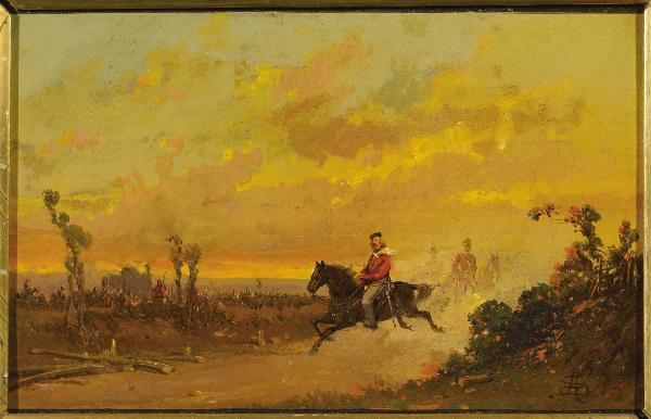Dipinto su tavola con scena storico-narrativa in paesaggio naturale