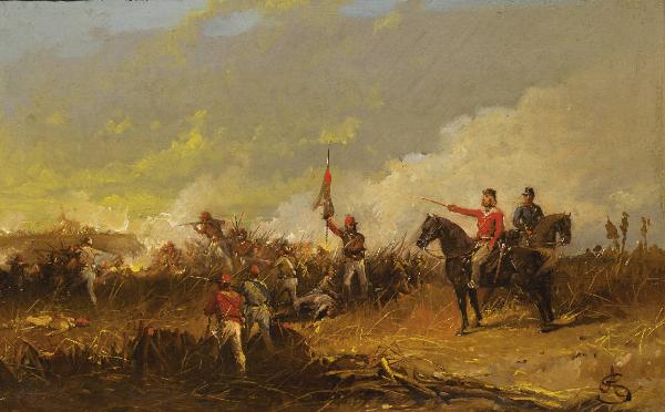 Dipinto su tavola con scena storico-narrativa in paesaggio naturale