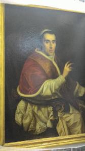 Dipinto su tela con ritratto maschile a figura quasi intera, seduta, di tre quarti, benedicente