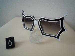 Occhiali da sole con forma irregolare a farfalla, montatura bianca e nera.