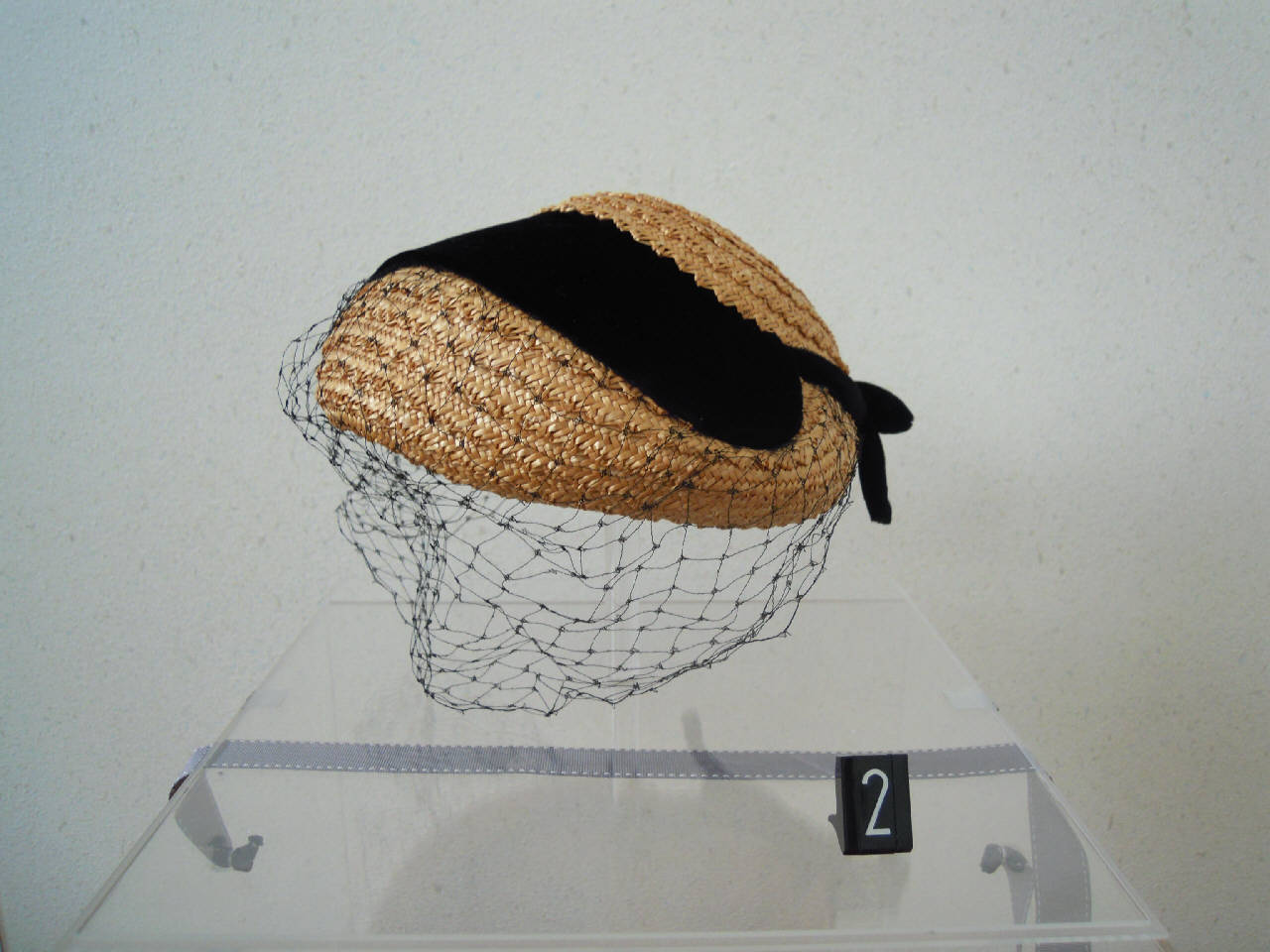 Calottina di paglia con veletta e visiera in velluto nero e fiocco sul retro.