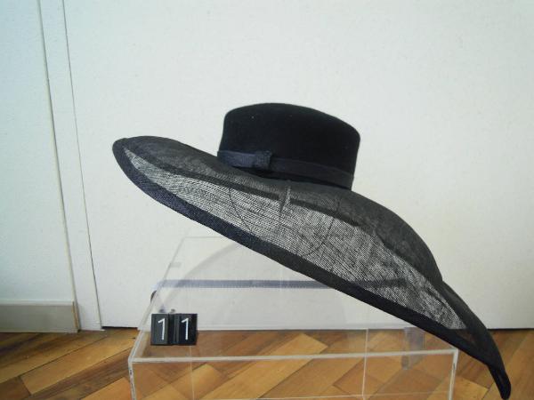 Cappello di paglia nera a tesa larga e irregolare, cupola e cinta in panno nero.