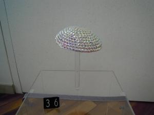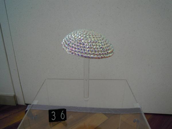 Calottina ricoperta di grossi strass cuneiformi su base di tessuto bianco.