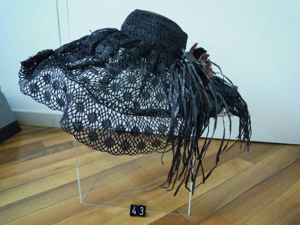 Cappello in pizzo nero a tesa larga morbida con applicazione di fiori e raffia.