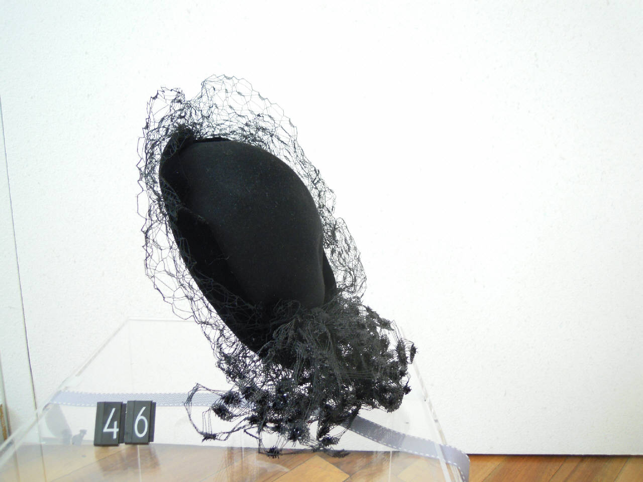 Cappellino senza tesa in feltro nero con cinta in velluto nero, fiocco in pizzo e veletta