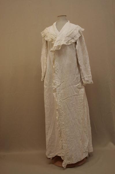Vestaglia lunga, in tela bianca. Davanti e dietro costituiti ciascuno da due teli; sul davanti apertura totale senza sistema di chiusura, sul dietro cucitura centrale con ampia piega a cannone sotto il punto vita. Nelle cuciture laterali all'altezza dei fianchi aperture per accedere all'interno.\nAmpio collo sciallato, maniche lunghe, ampie e diritte.\nCollo, apertura e polsi profilati da alta ruche in batista bianca con motivo di rigature e pois tono su tono (orditi a spessore maggiore e trama lanciata tagliata).