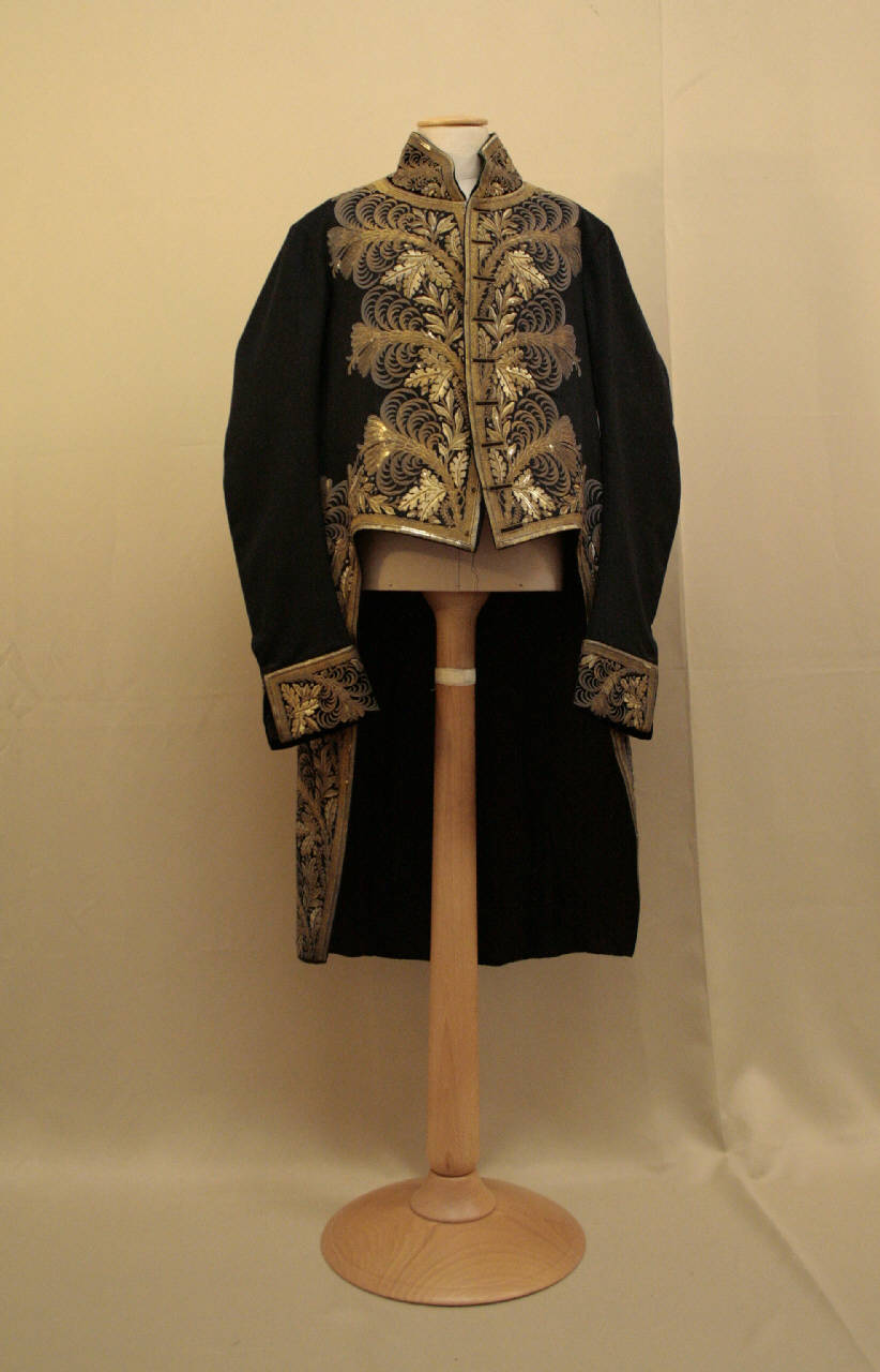 giacca frac in panno blu scuro, con collo e paramani in velluto tagliato verde scurissimo. Ampio ricamo in vari tipi di fili dorati, cannutiglia, paillettes, couvettes. Il ricamo raffigura serti intrecciati di quercia e alloro da cui fuoriescono palme.\nCollo a cinturino (h 8cm), mostre appena stondate con traccia di 9 bottoni perduti e 9 occhielli funzionali.\nTaglio in vita, falde solo posteriori ampie e patte ornamentali appena sotto la vita.\nManiche molto lunghe, aderenti, sagomate con paramani.\nDorso ampio corto alla vita; finte pieghe laterali; spacco centrale con ampia sovrapposizione.\nControfodera rigida e fodera in diagonale blu.