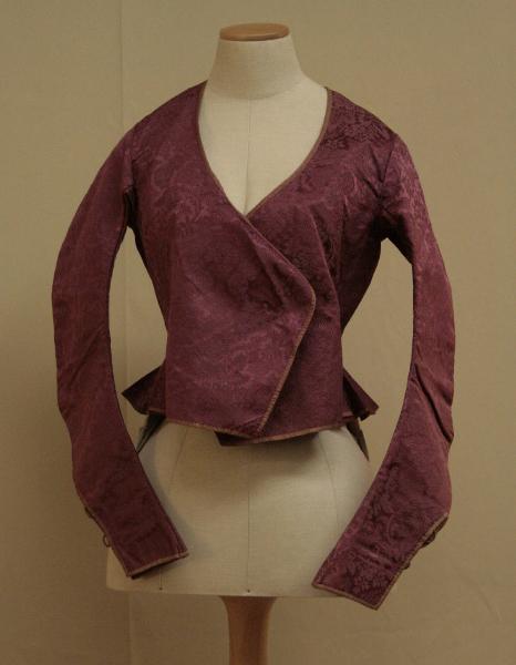giacca casacchino aderente steccata, in damasco viola tendente al rosso, con decoro monocromo a piccoli fiori e frutti su fondo a minuti motivi geometrici.\nDavanti in 2 pezzi, con apertura incrociata con ampia sovrapposizione, senza sistema di chiusura. Ampio scollo ovale, linea delle spalle spostata sul dietro. La giacca scende oltre la vita con brevi falde svasate, ampliate da 6 gheroni, che formano fitte pieghe.\nManiche lunghe a coprire la mano, aderenti e sagomate, con spacco al fondo chiuso da due bottoni rivestiti.\nScollo, orlo e fondo maniche profilati da nastro in taffetas rosato (sbiadito). \nFodera in tela bianca che sul davanti forma busto staccato, con scollo sotto il seno, chiuso da fettucce. Due stecche ai lati dell'apertura; la chiusura originale con occhielli tondi per laccio passante è stata ripiegata e cucita all'interno per stringere l'indumento.