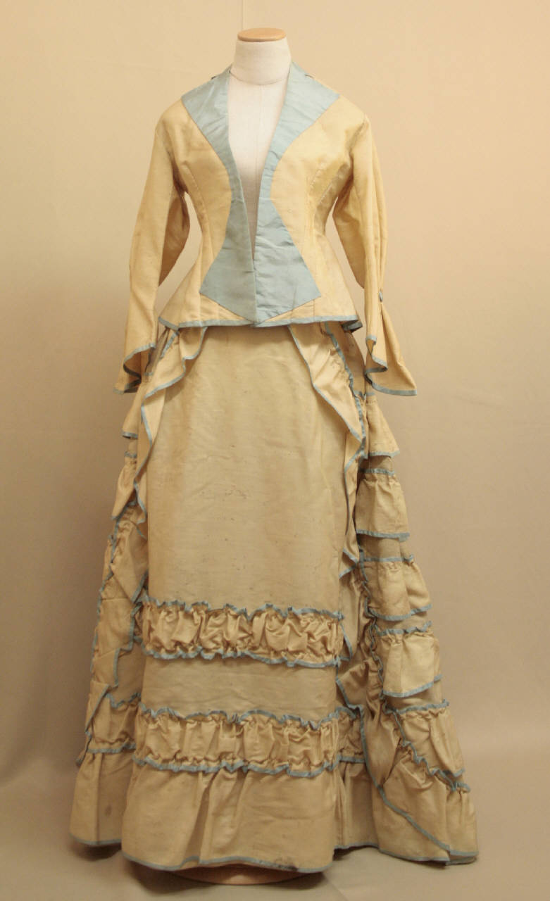 giacca in louisine avorio con profili in taffetas celeste. Svasata, senza sistema di chiusura. Scollo con piccoli risvolti celesti e, lungo l'apertura, triangoli celesti applicati a simulare risvolti. Davanti in due pezzi, sagomati da pinces chiuse. Dietro con dorso in due pezzi e fianchette svasate; al centro sotto la vita spacco profilato da triangoli celesti analoghi al davanti. Maniche lunghe, svasate, riprese sopra il gomito con piccole pieghe fermate da 2 bottoni rivestiti in taffetas celeste.\nLa fodera è perduta.