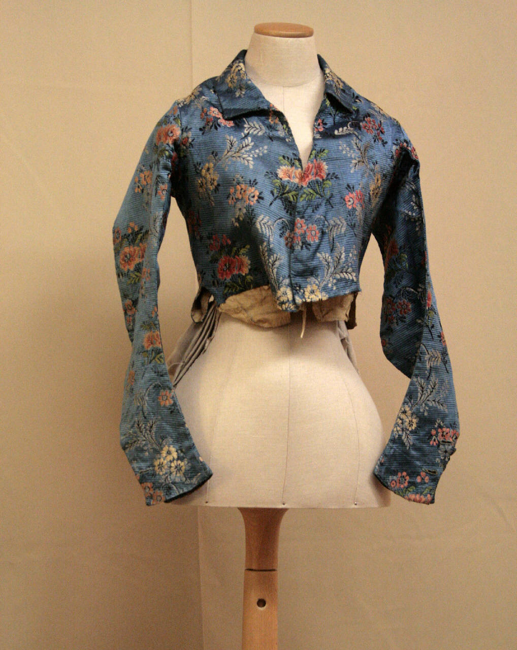 Giacca spencer in cannellato azzurro con decoro a meandro di tralci e mazzetti di fiori. Corte poco sopra la vita, davanti in due pezzi accostati al centro senza sistema di chiusura. Dorso in due pezzi, stretto e romboidale. Scollo a V (modificato) con collo semplice; maniche lunghe a coprire la mano, aderenti e sagomate, al fondo spacco chiuso da 2 bottoni e occhielli. Orlo con piccole falde alterato e manomesso; dietro breve coda a pieghe decorata da 2 bottoni rivestiti.\nFodera in tela naturale che sul davanti forma busto staccato chiuso al centro da lacci.