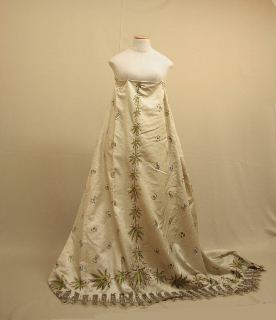 abito semiconfezionato, parti di modello impero: gonna con lungo strascico, maniche corte a palloncino, telo, in diagonale avorio ricamata in seta, ciniglia, argento, paillettes, cannutiglia, borchiette ovali. Il ricamo a disposizione descrive una ghirlanda di foglie pentalobate con bacche o ghiande, disposta verticale al centro davanti e lungo l'orlo. Sul fondo sono sparsi piccoli motivi stilizzati in paillettes. L'orlo della gonna è sagomato a profonda dentellatura sostenuta da una banda di tulle ricamato e smerlato.\nIl davanti e il dietro della gonna sono formati da un telo centrale affiancato da due gheroni: le cuciture tra telo e gheroni sono eseguite prima del ricamo; le cuciture laterali tra davanti e dietro sono filze a punti lunghi, in filo di cotone (probabile intervento recente). Il taglio delle maniche non è completo e nella parte alta è praticata una arricciatura irregolare e grossolana. Il telo era probabilmente destinato alla confezione del corpino.