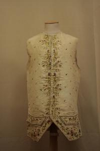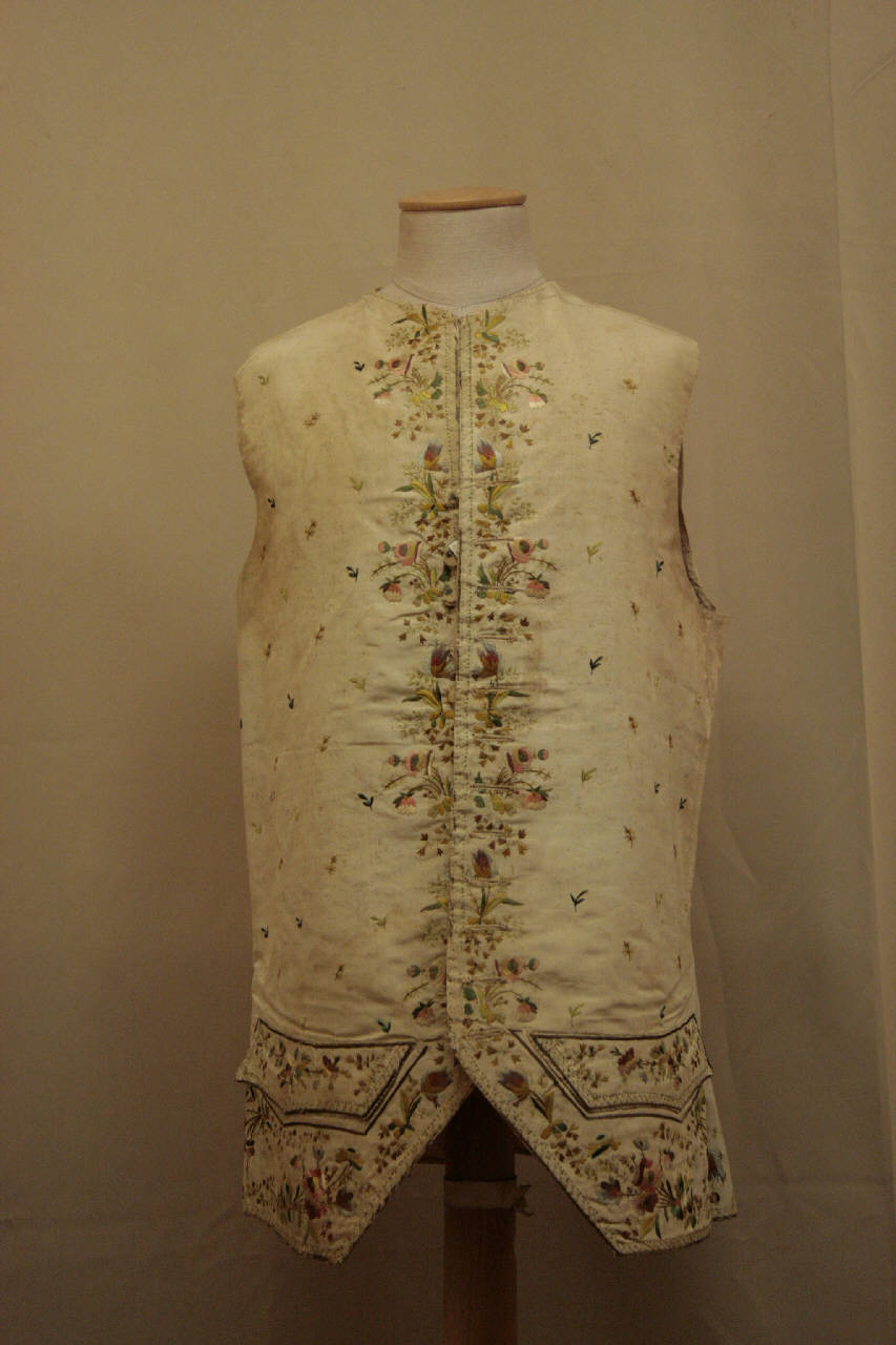 Gilè in louisine avorio, ricamato con seta policroma a punto piatto, erba, nodi e lanciato, con motivo di rose e fiori tipo tulipani; sui quarti anteriori piccole foglie stilizzate a scacchiera. Girocollo, mostre diritte chiuse da 12 bottoni rivestiti e ricamati (di cui 1 mancante) e occhielli corrispondenti dal petto alla vita; falde divergenti a punta, con tasche basse e patte appena sagomate. Fodera dei quarti anteriori e dorso in tela naturale. Dietro regolabile con coppia di lacci.\nSul dietro, in basso, una scritta ad inchiostro, illeggibile per la presenza di un rammendo.