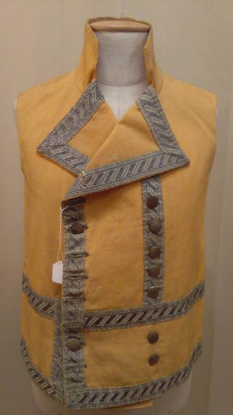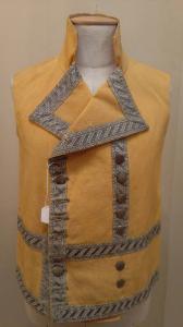 gilè doppiopetto, corto e diritto in vita. Quarti anteriori in tela di lana giallo albicocca. Chiusura con 20 bottoni di metallo argentato posti a coppie (di cui 8 mancanti). Alto collo con ampi risvolti. Un gallone artentato profila l'apertura, i risvolti e l'orlo; definisce la posizione dei bottoni e delimita una banda lungo l'orlo. Dorso in tela bianca regolabile con due coppie di fettucce.\nNel collo, all'interno, scritto ad inchiostro "Lunardo".